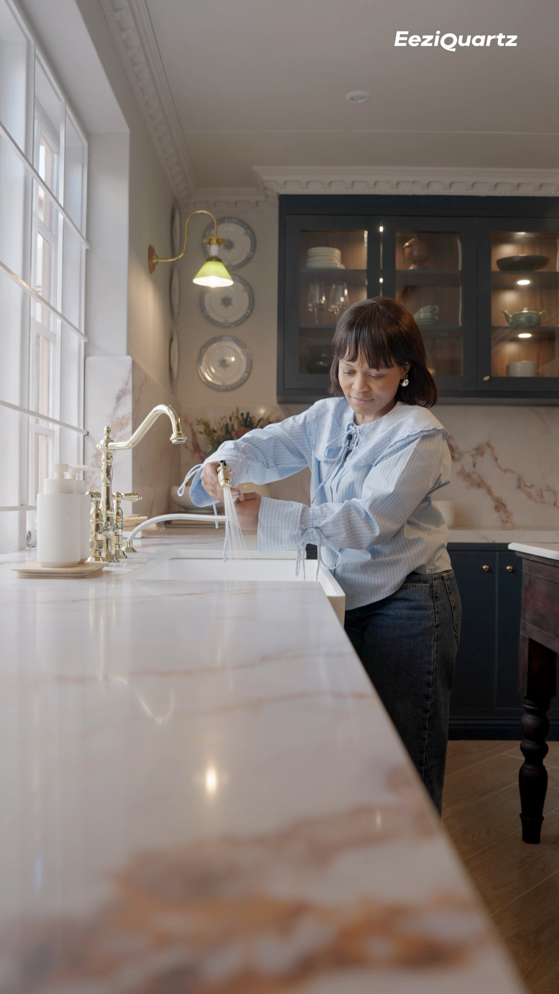 Filmed promotional video for Eezi Quartz to showcase the Aurelia countertop that transformed Wendy Sibiya's English Country kitchen.